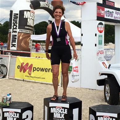 Christa Dwyer (pictured on the podium) competed in the North Fork triathlon on July 13th and finished 2nd in her age group! Christa improved over last years’ overall time by 11 minutes in this sprint triathlon!!! That is a HUGE improvement. Christa has been doing fantastic in training as well as in the weekly summer run series, so this improvement in the Mighty North Fork is NO surprise! She will be competing in Ironman Florida this November!!